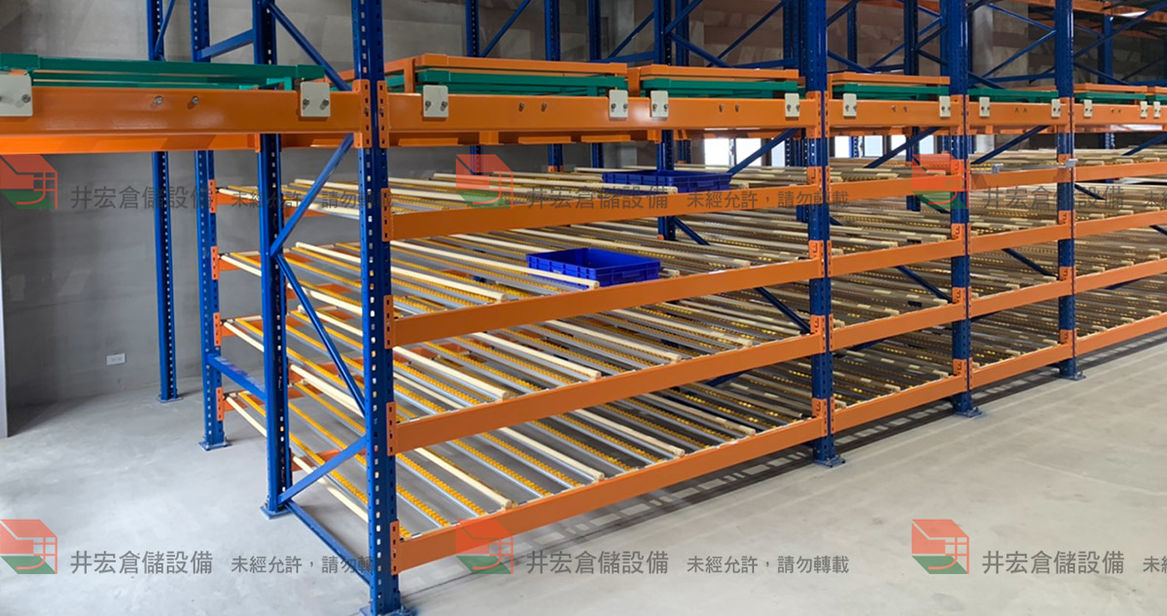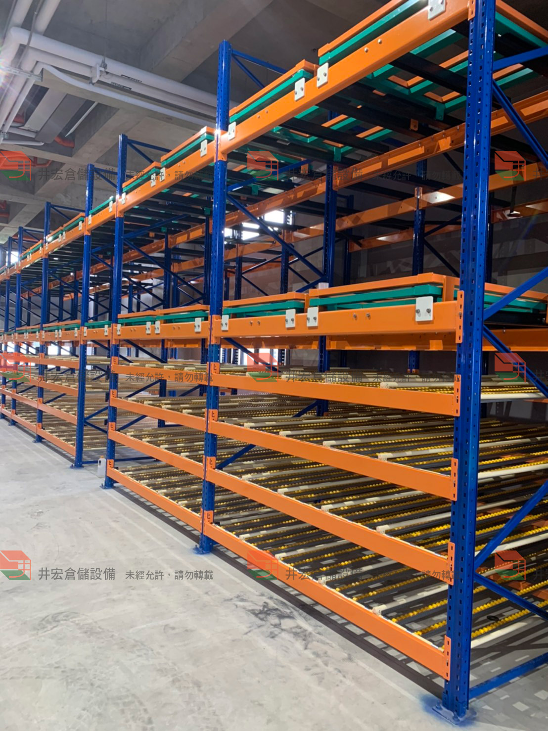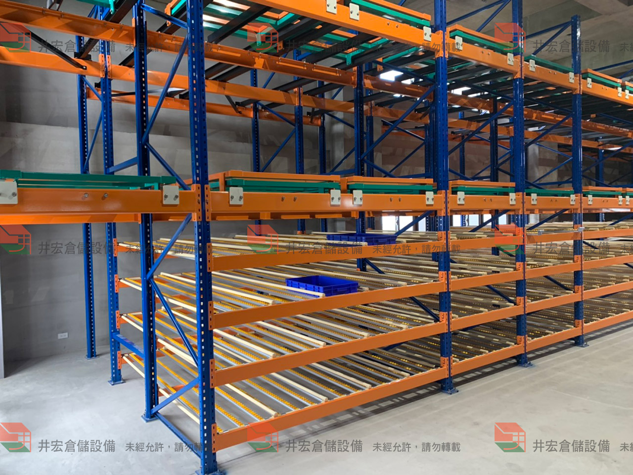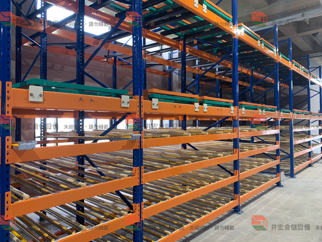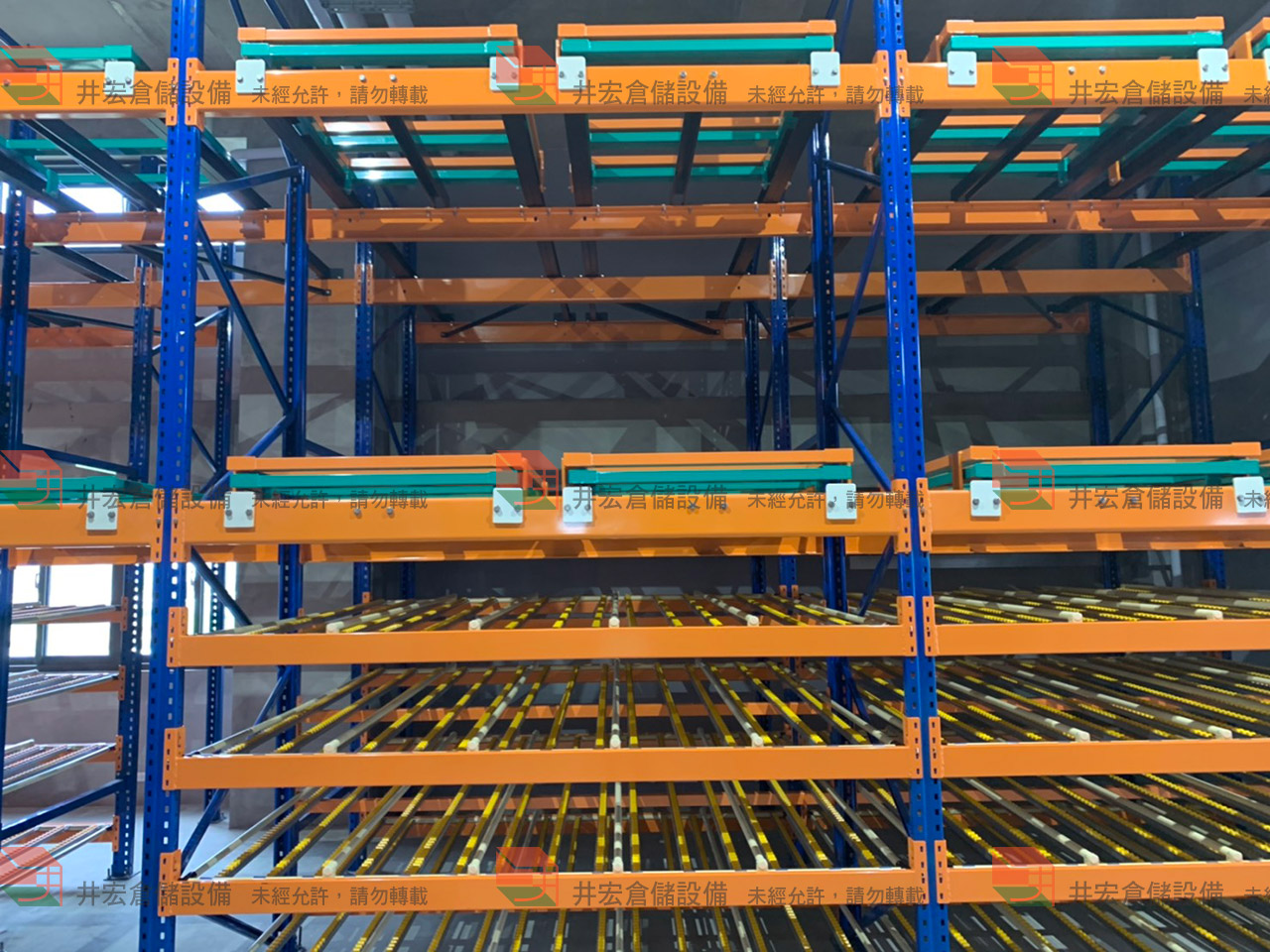 客戶食品倉庫區,為同時存放棧板貨和整理散貨,上規劃後推式可採先進後出棧板架,下可先進先出輕鬆拿取散貨,達到快速有效及減少人力的動線規劃,採客製化設計可符合實際需求,施工時間約三天